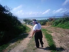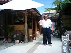 レストラン「かにふ」の前にて。ほぼ毎日通いつめました。